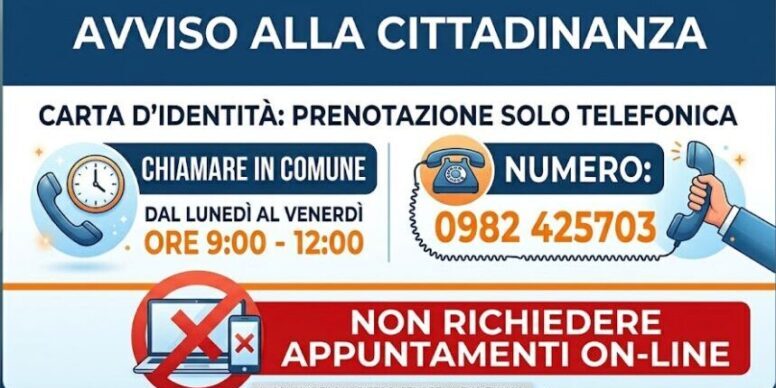 Si informa la cittadinanza che, al fine di ottimizzare la gestione delle richieste, il rilascio della carta d’identità avverrà esclusivamente tramite appuntamento telefonico.